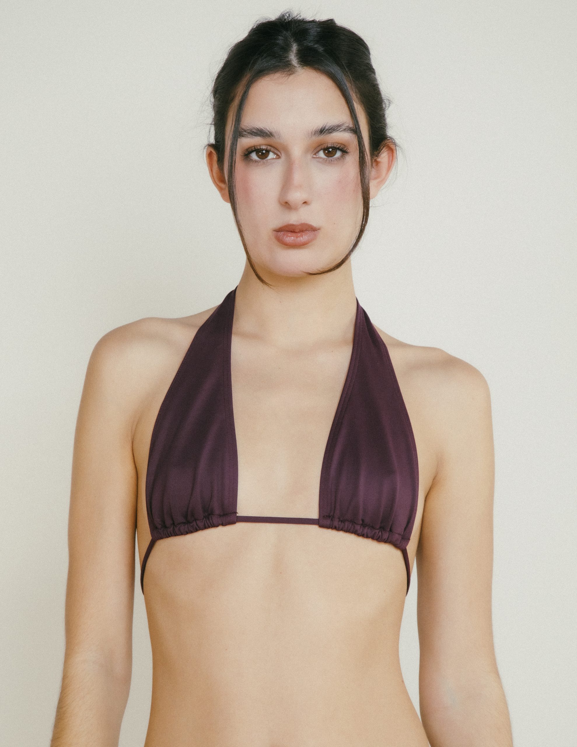 Top triangular en color ‘Queen of night’ con tirantes anchos y cierre con lazada en espalda.
