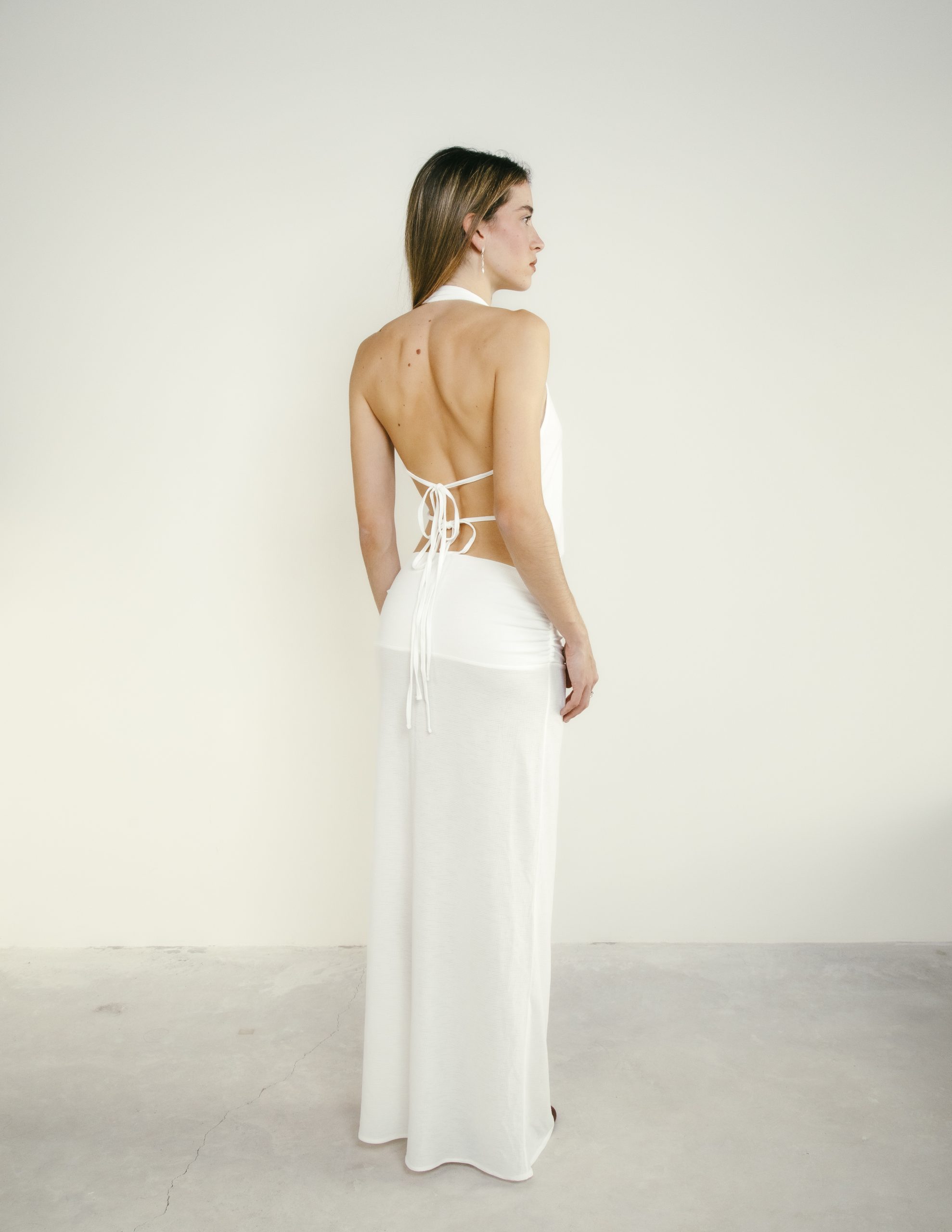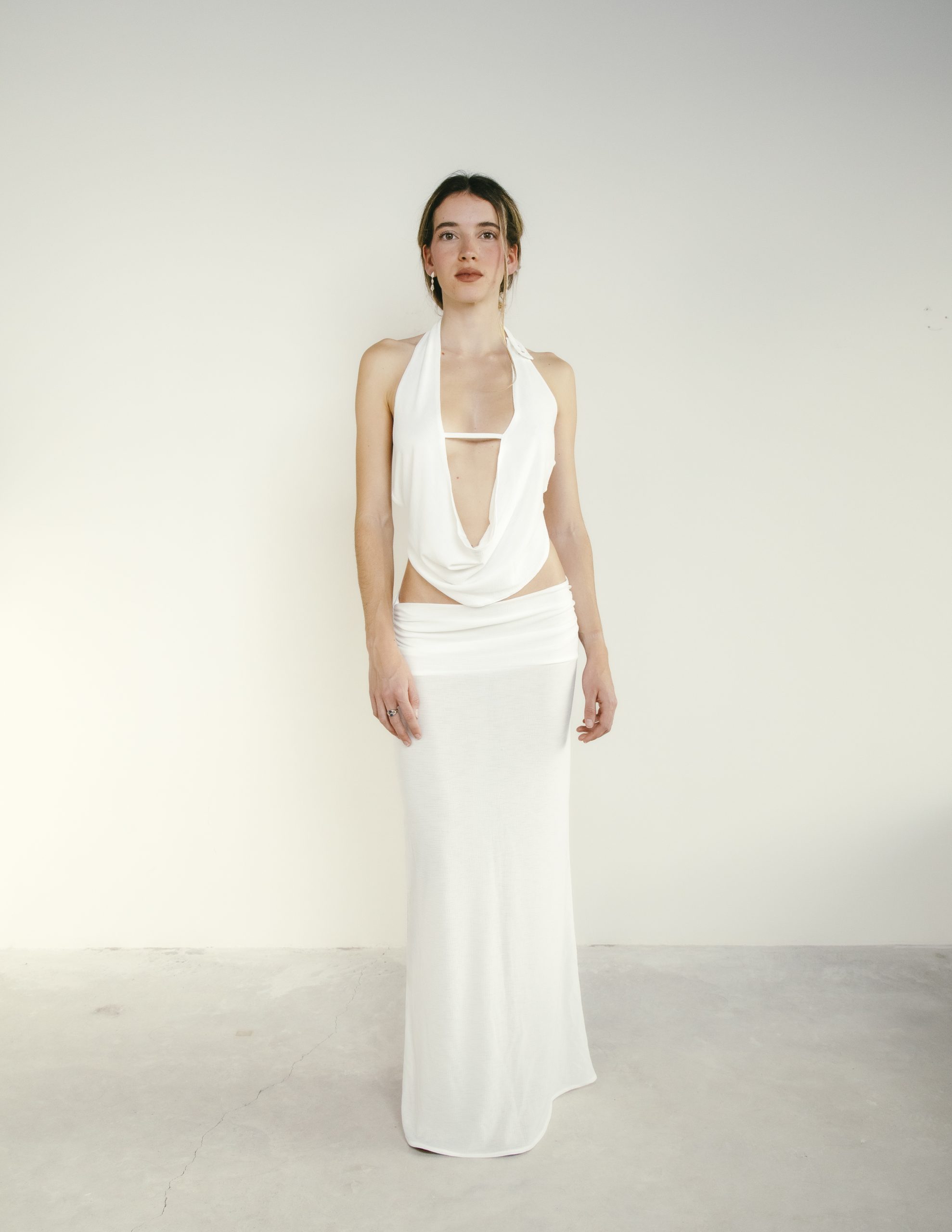 Falda midi con doble cinturilla elástica y detalle de frunces. Tiro medio con caída en bajo.