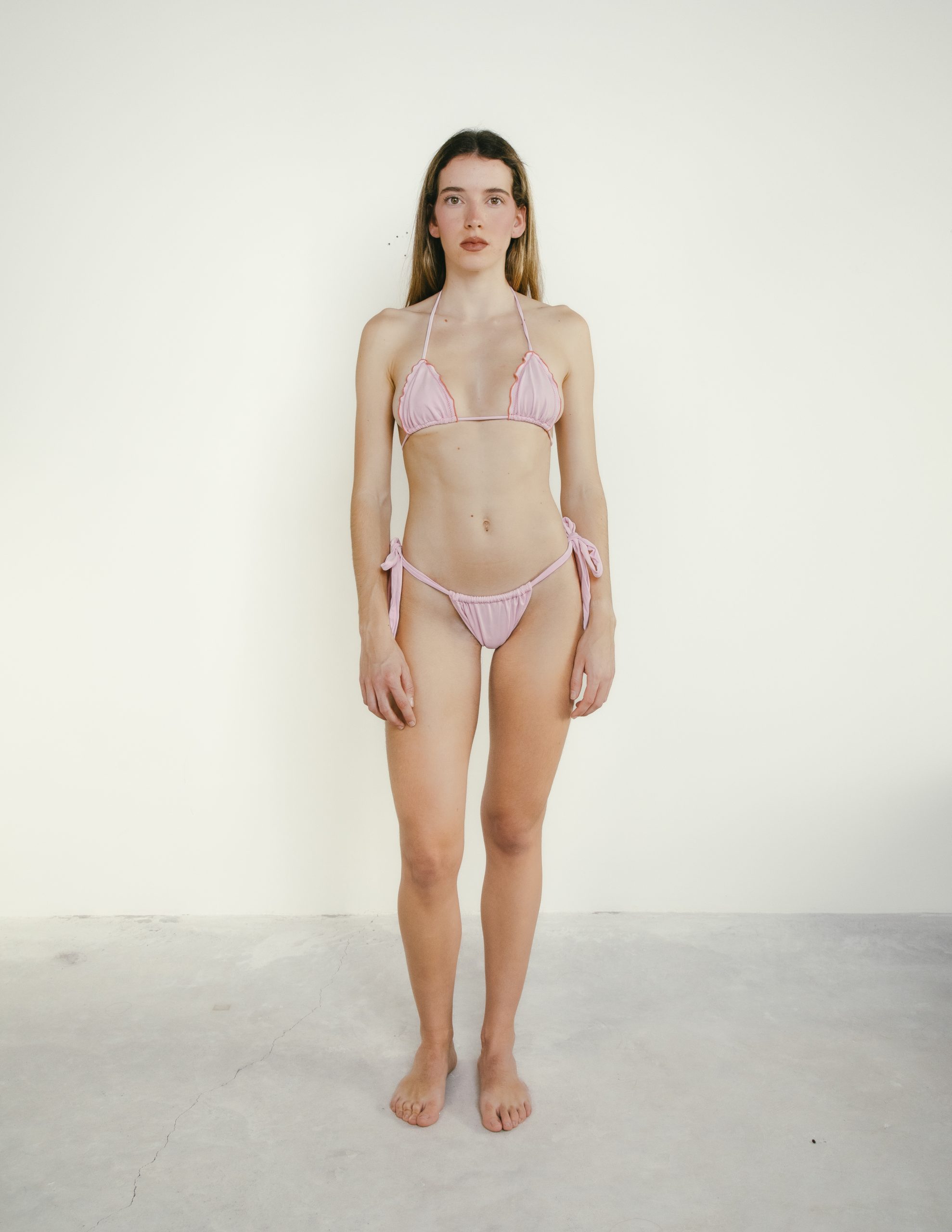 Pink triangle top with shoulder straps, tie-back closure, ruffled edges and contrast stitching.