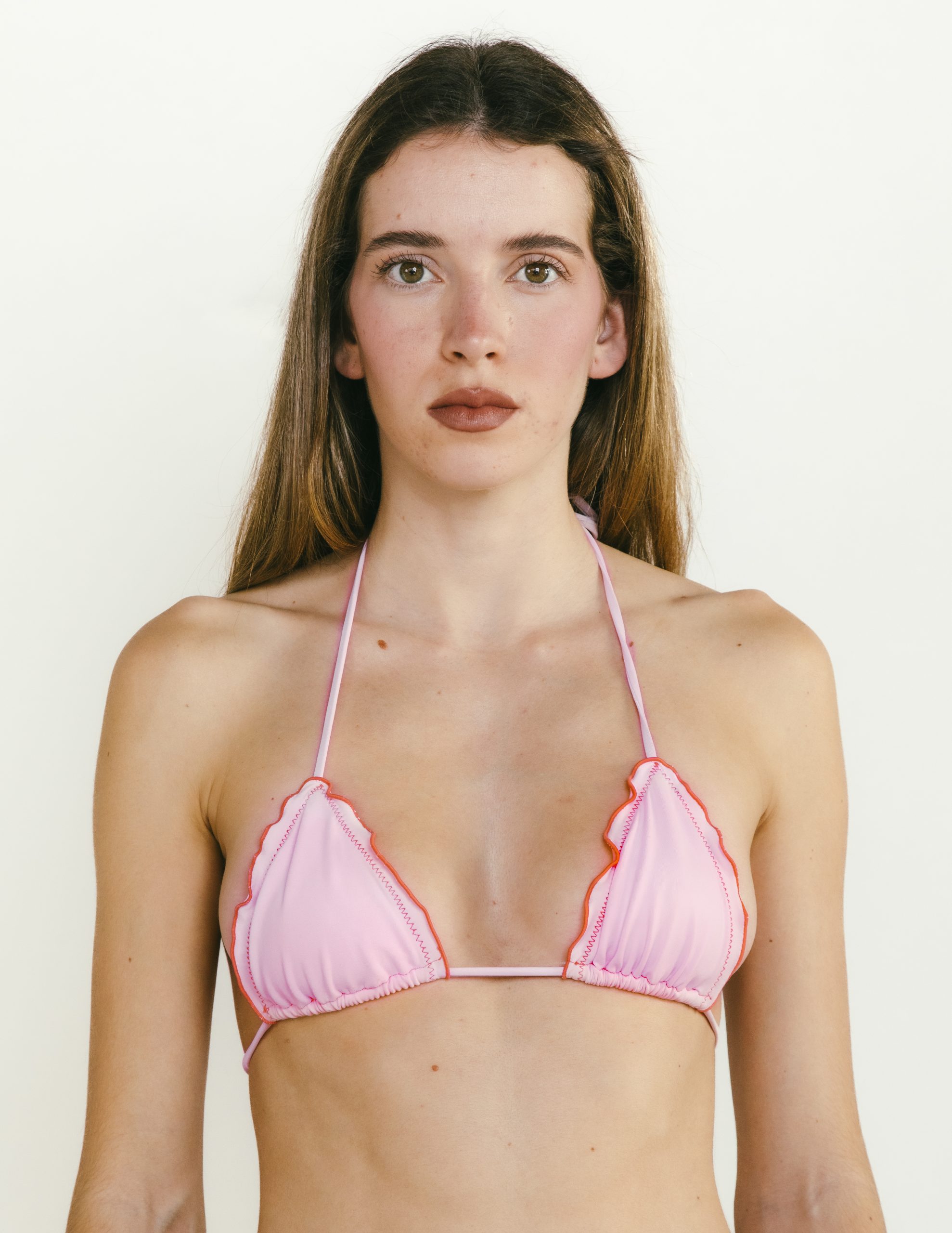 Top triangular en color rosado, con tirantes y lazada en la espalda, acabado en volantes y pespuntes en contraste.