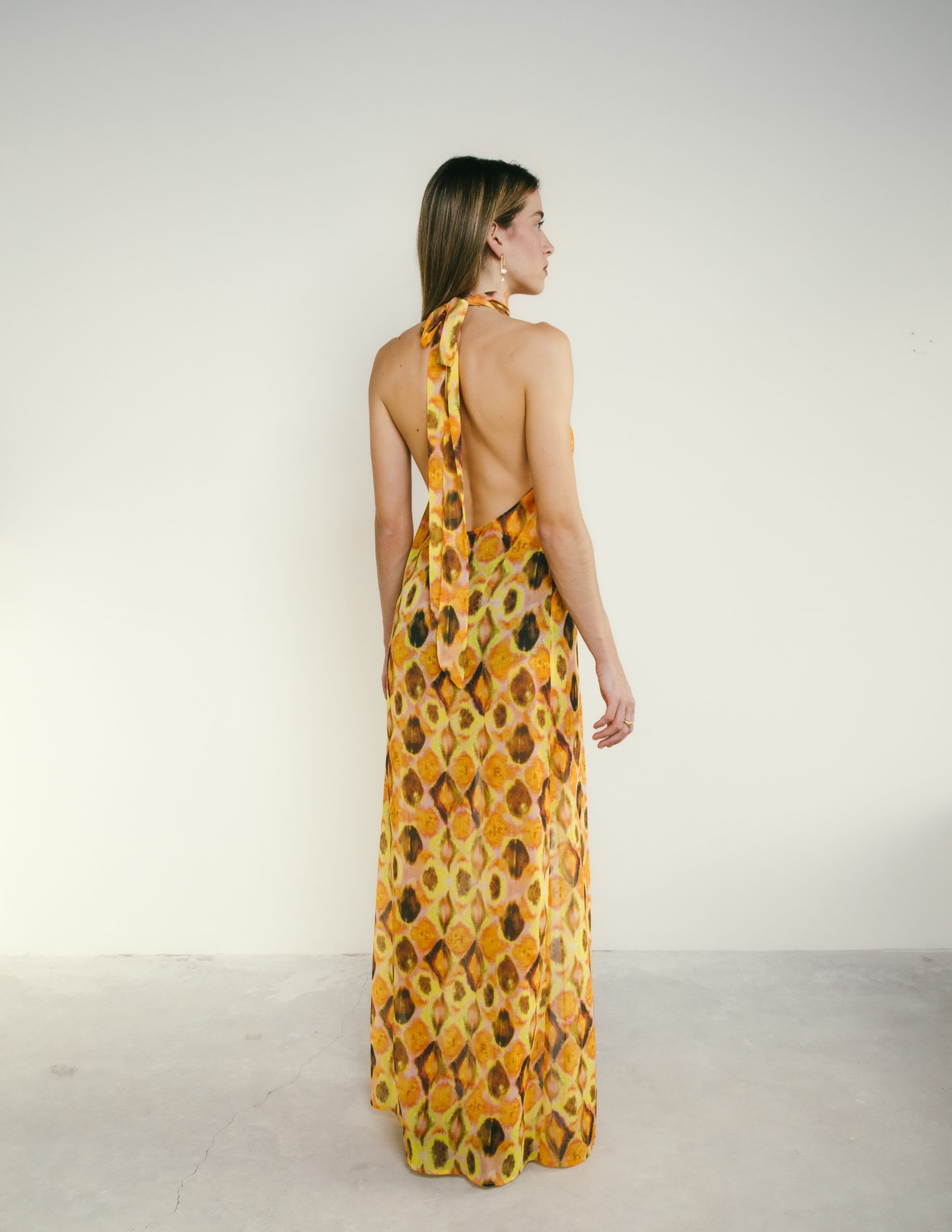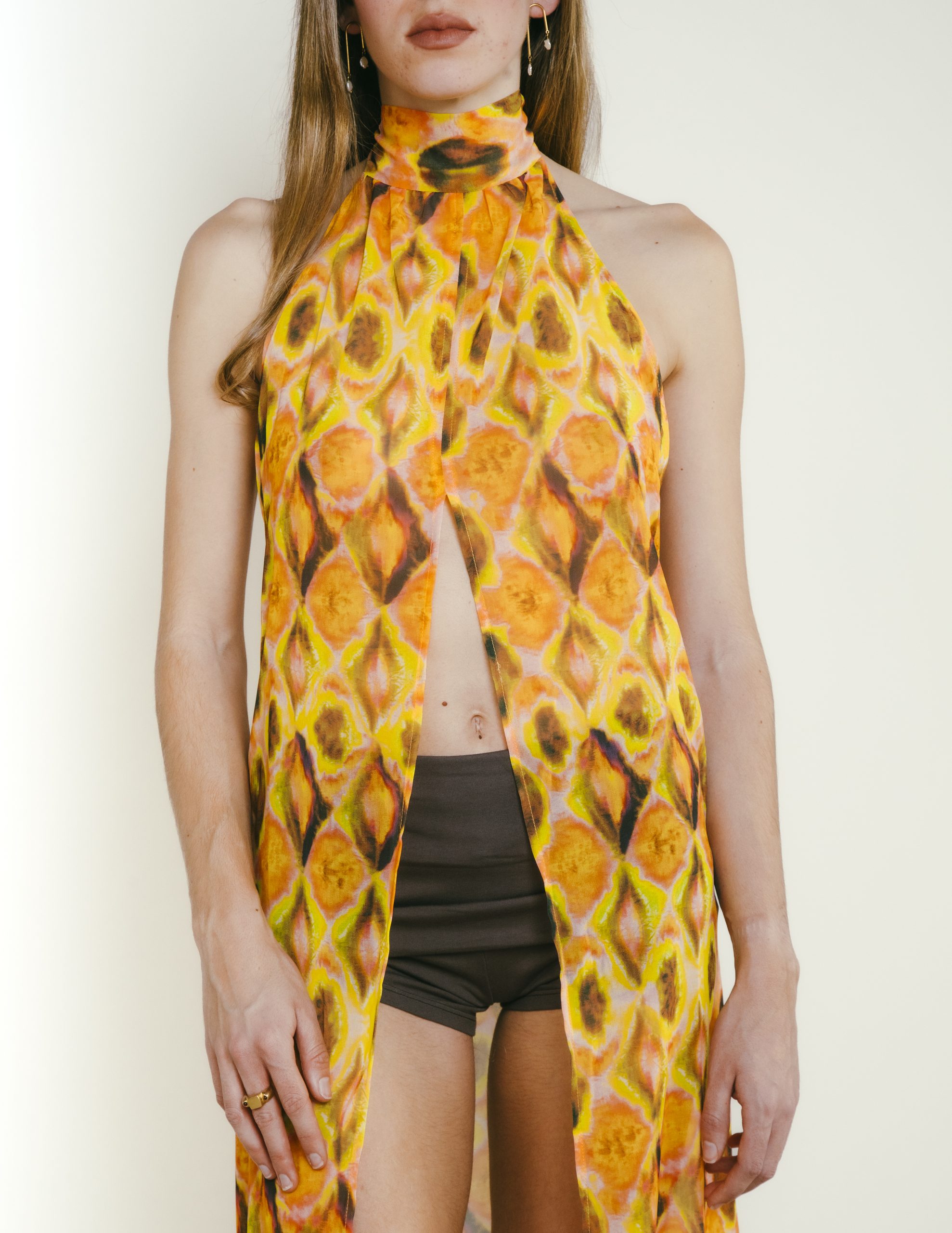 Long halter-neck top with front slit. Open back with tie at the neck. Flared hem finish.