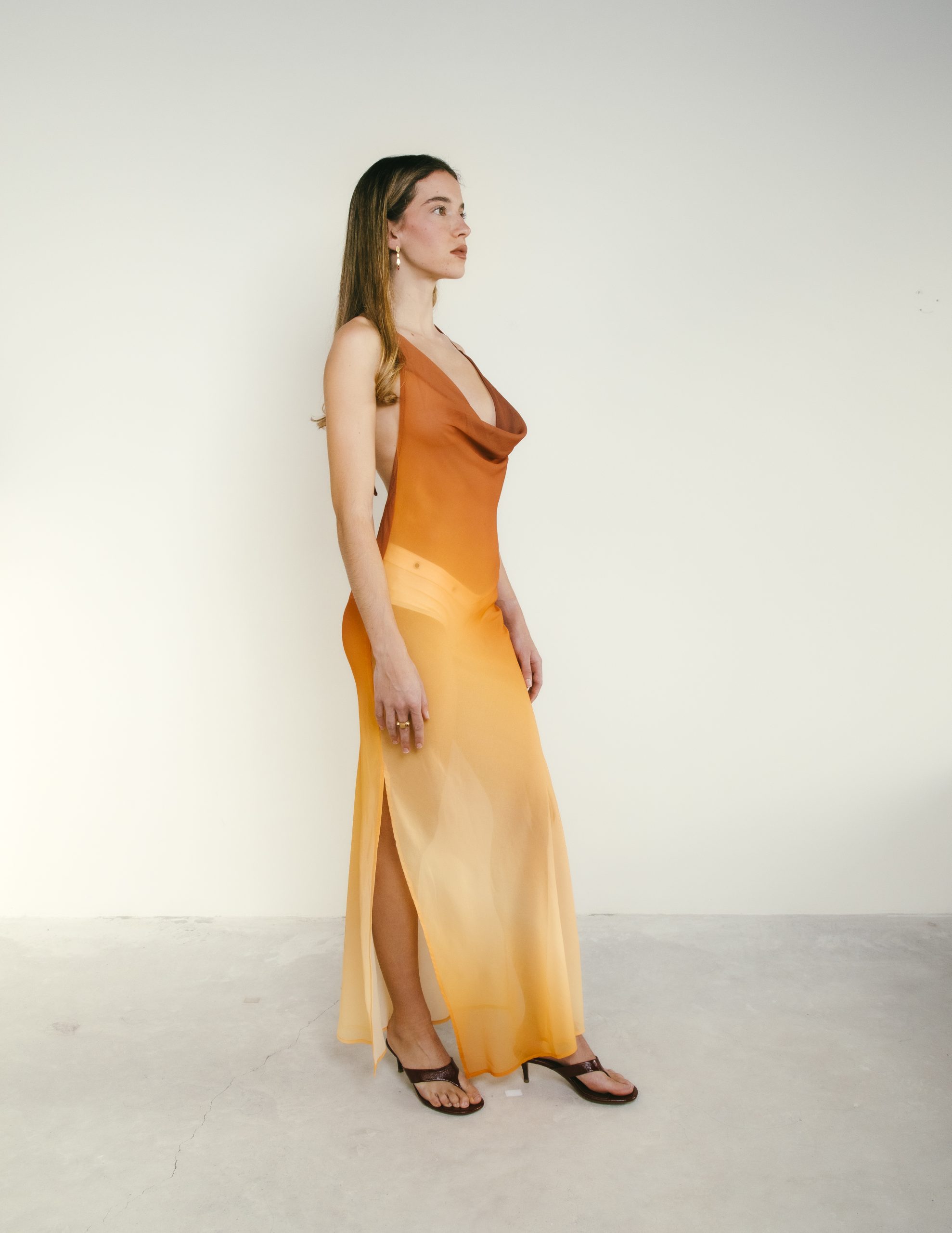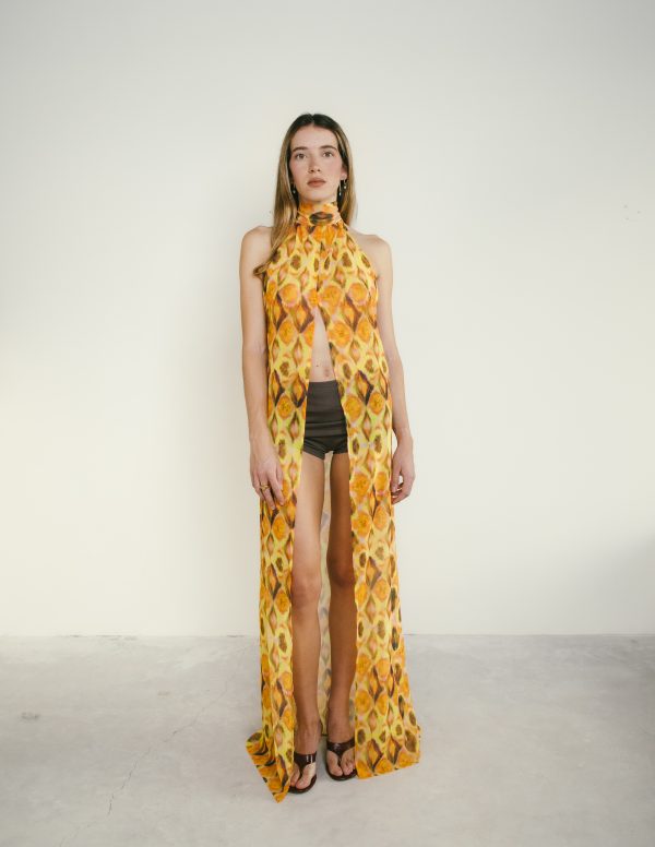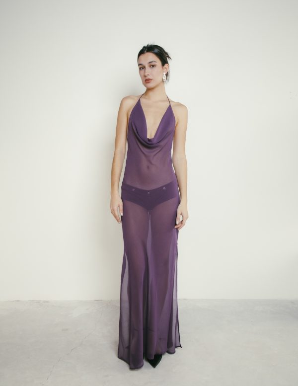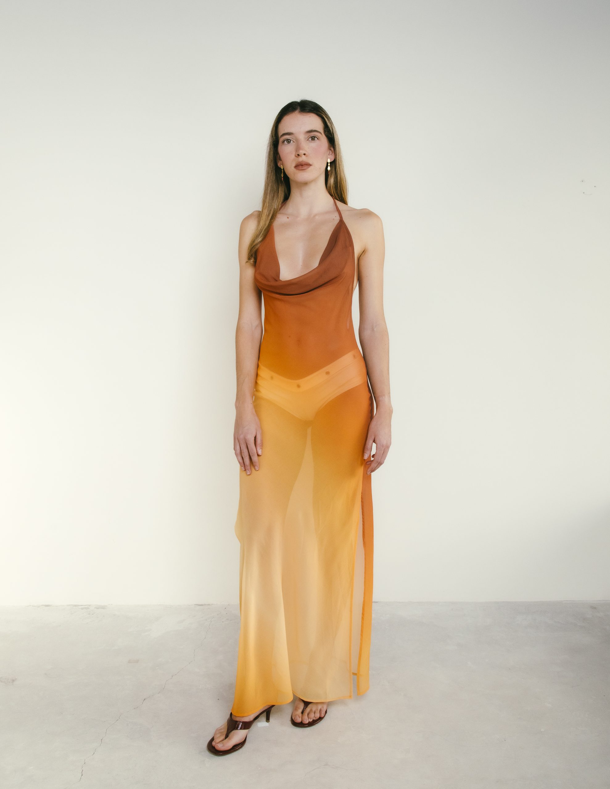 Long halter-neck dress with deep round neckline. Open back with double tie straps. Flowing hem finish.